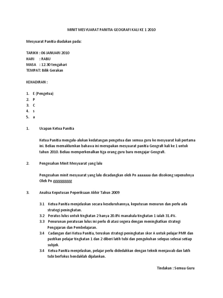 Contoh Minit Mesyuarat Panitia Geografi Kali Ke 1 2010