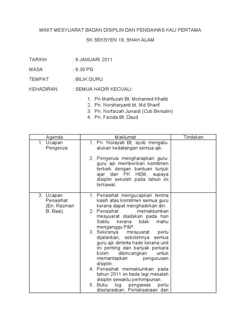 Minit Mesyuarat Badan Disiplin Dan Pengawas Kali Pertama