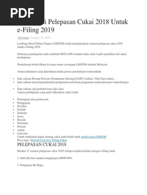 21 Senarai Pelepasan Cukai 2018 Untuk E Filing 2019