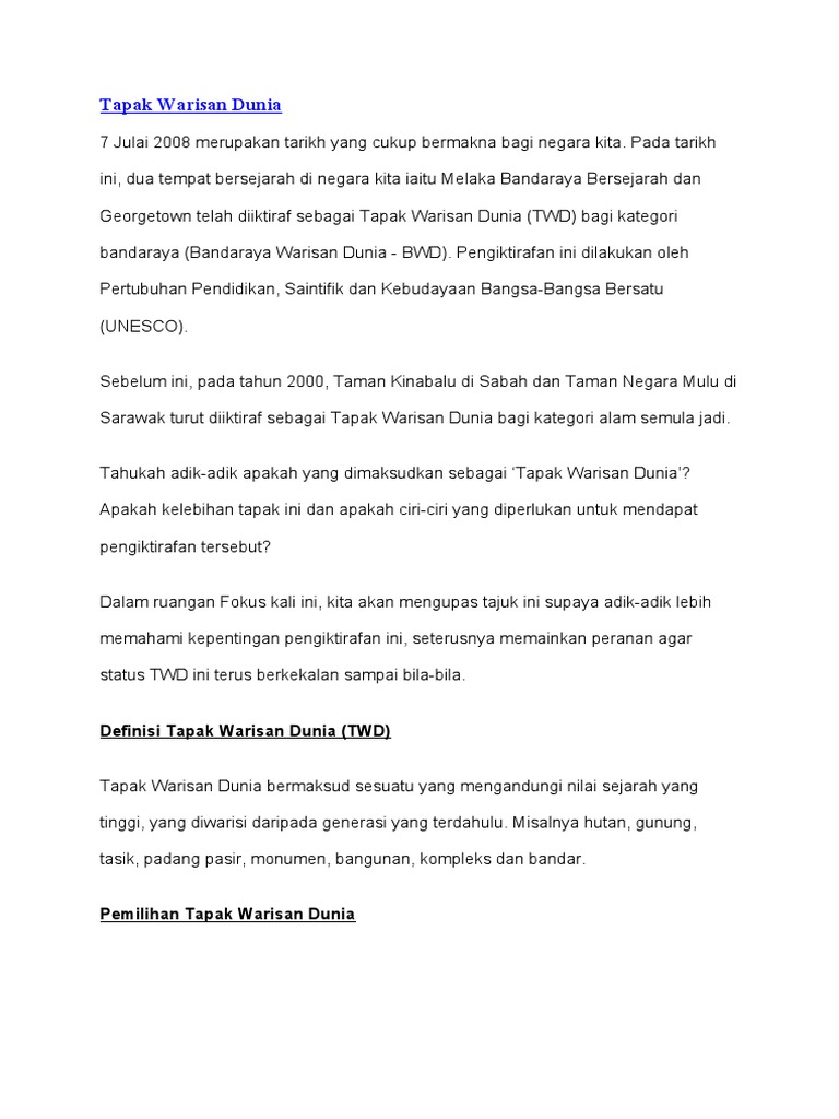 Tiga Tapak Baharu Dicalon Tapak Warisan Dunia Unesco Tive List Dan Pantun Secara Multi National Pdf Document